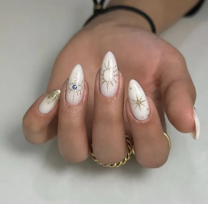 Тук виждаме бяла основа и още веднъж слънце, само че пък акцентите са по-смели. Големите златни линии и прибавянето на признака „ око “ трансформират дизайна в нещо като амулет против зли очи. Маникюрът наподобява като аксесоар самичък по себе си, само че е елементарно да си го представим в композиция с пръстени и гривни. Почти съвършен образец за бохо жанр.