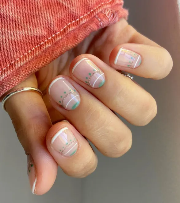 Последният дизайн в лист ни е доста лек и пресен - транспарантна основа с бели и зелени линии, плюс дребни точки и брокатени акценти. Този френски маникюр на къси нокти наподобява толкоз изтънчен, като че ли е нарисуван с акварелни бои, и е съвършен за тези дами, които търсят моден, само че по едно и също време с това необикновен вид за маникюр.