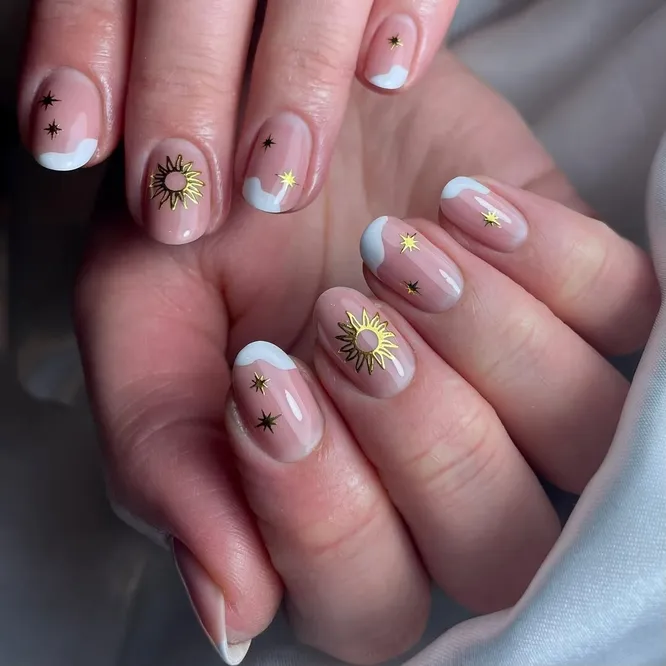 В основата на първия дизайн е контраста сред класиката и магията. Този гальовен френски маникюр с асиметрична линия е допълнен от златни слънца и звезди. Благодарение на това, една привидно семпла основа се трансформира в моден бохо вид, който наподобява по едно и също време грациозен и малко тайнствен.