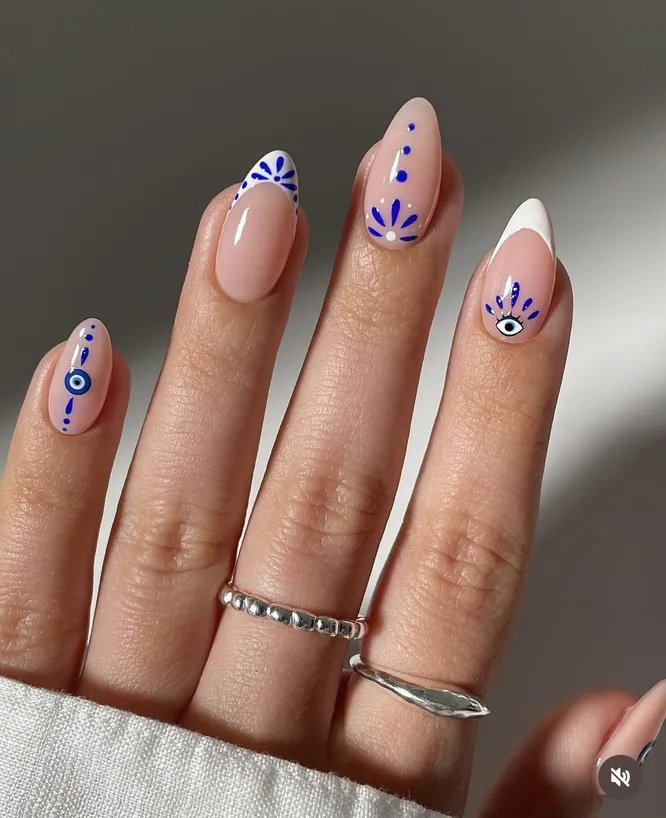 Предпоследният ни вид е по-закачлив и несъмнено носи чувство за лято в Гърция или Турция. Ярко сините знаци, напомнящи етнически шарки, се открояват върху нюд основата, а окото на безименния пръст наподобява изключително стилно. Този детайл внася лека мистична атмосфера в маникюра.