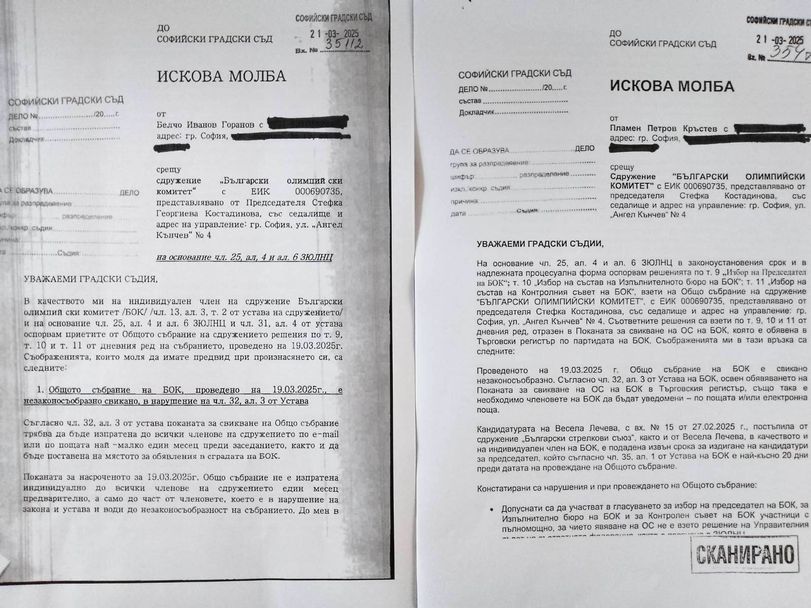 Исковите молби, подадени против извършеното на 19 март 2025 година Общо заседание на Българския олимпийски комитет, са идентични, демонстрира инспекция в Софийския градски съд.