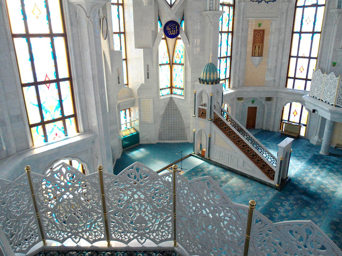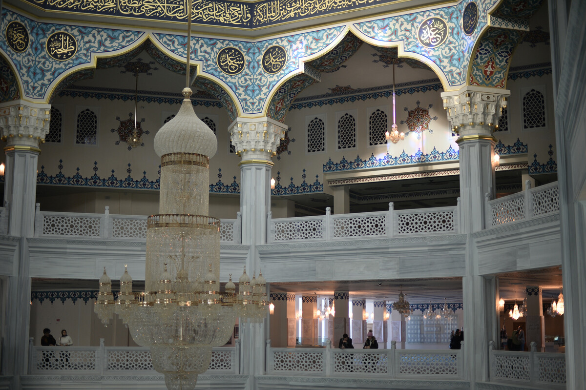 Рамил Ситдиков/Sputnik По периметъра на залите са ситуирани балкони, които побират доста хора. Общо в джамията могат да се поберат до 10 000 души. Мраморът за декорацията е импортиран от Канада (този тип е най-подходящ за леден климат), а главният бистър полилей с тегло 1,5 тона и парадните резбовани порти са подарък от държавното управление на Турция.