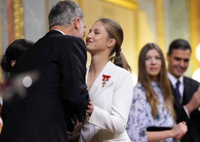" Кълна се да извършвам правилно своите отговорности, да пазя Конституцията и да изисквам да бъдат защитавани Конституцията и законите, да почитам правата на жителите и самостоятелните общности и да бъда вярна на краля " , сподели Леонор, преди да бъде приветствана. Видимо разчувствуван, крал Фелипе Шести целуна щерка си.