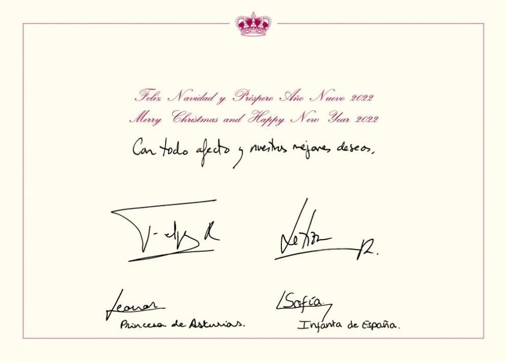 „ Весела Коледа и Честита Нова година 2022. С цялата ни любов и най-хубави пожелания “, гласи известието на картичката, която е подписана от краля, кралицата и двете принцеси.