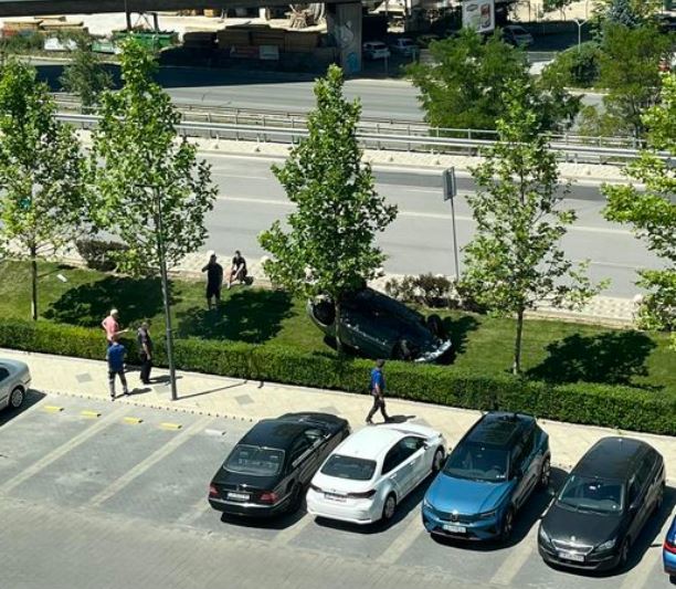Лек автомобил се е обърнал по таван в полянка на улица " Донка Ушлева " 2, край огромна офис постройка.