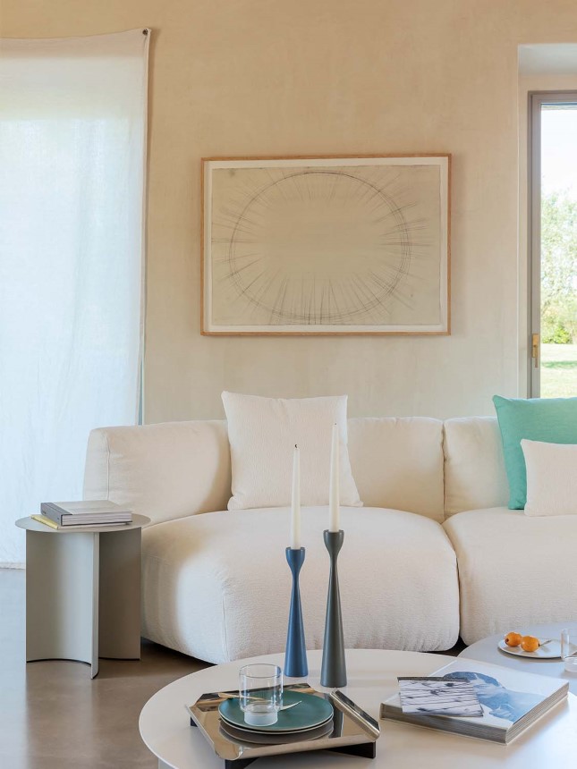 Мебелите от сбирката се съчетават отлично с ниската масичка за кафе Pierre (дизайн StudioContromano), която се предлага в четири размера и с многообразие от покрития- бронз, бяло, сиво, оксидирано, сребърно, необитаем камък, матирано, полирано…Различните височини на масичките разрешават основаване на истински композиции в дома.