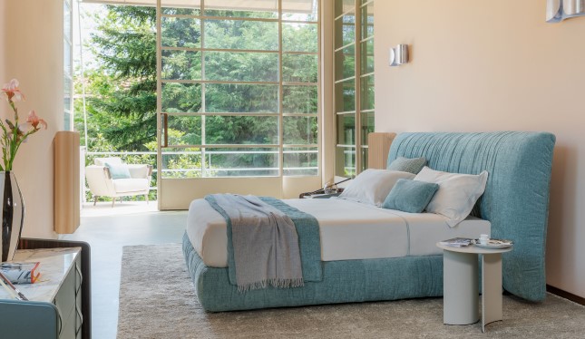 Baia (дизайн Emanuela Garbin) е двойно легло с изискан дизайн. Рамката му е мека и тапицирана, поддържана от тънки железни крачета, които й придават лек и безусловно актуален тип. Откритите шевове и нежната, едвам забележима извивка вършат таблата хармонична и стилна. Именно такива елементи разкриват изключителното качество на продуктите, предлагани от Flou, както и традициите в шивачеството, които слагат всички текстилни кревати от сбирките на компанията на равнище на същинско произведение на изкуството.
