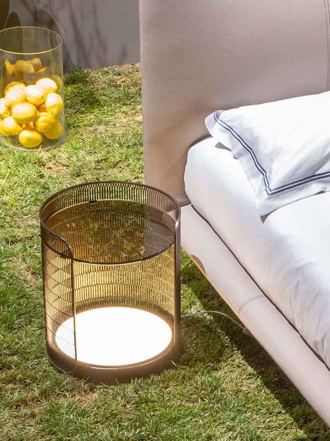 Нощната масичка с вградено осветяване, Chiaro di Luna е функционална, практична и доста стилна. Цилиндричната форма е завършена с железна решетка, която основава забавна игра на светлина и сянка.