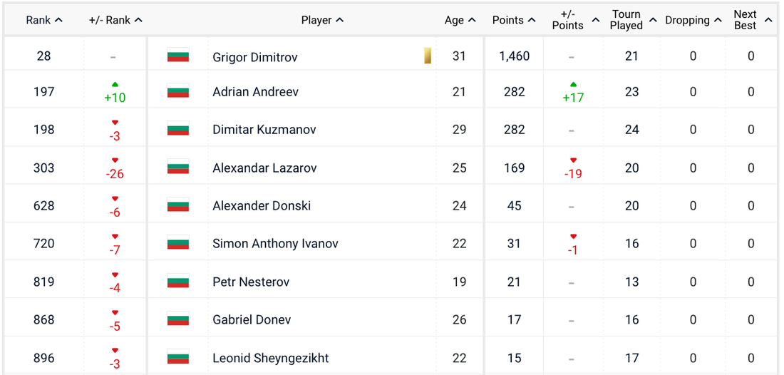 Причината за това достижение е 21-годишният Адриан Андреев, който записа ново рекордно класиране, откакто през предходната седмица доближи до четвъртфиналите на " Чалънджър ”-а във Валенсия (Испания). С 282 точки той се изкачи с 10 места и за първи път влезе в топ 200 на класацията на АТП, като заема 197-ата позиция. Така Андреев измести Димитър Кузманов от позицията на втора ракета на България.