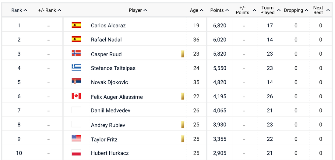 Испанецът Карлос Алкарас завършва годината на върха с 6820 точки, следван от сънародника си Рафаел Надал с 6020 точки и Каспер Рууд (Норвегия) с 5820 точки.