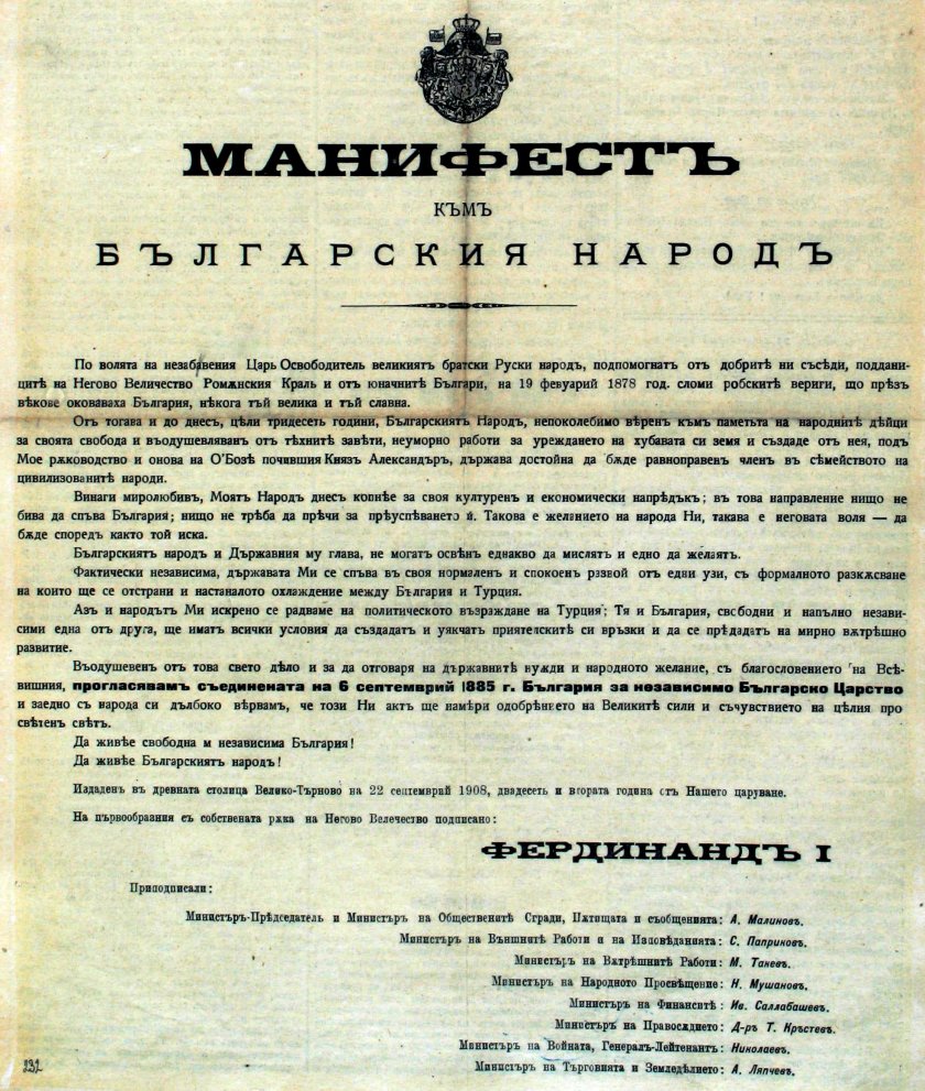Манифестът за прокламиране независимостта на България е прочетен от княз Фердинанд на 22 септември 1908 година във Велико Търново
