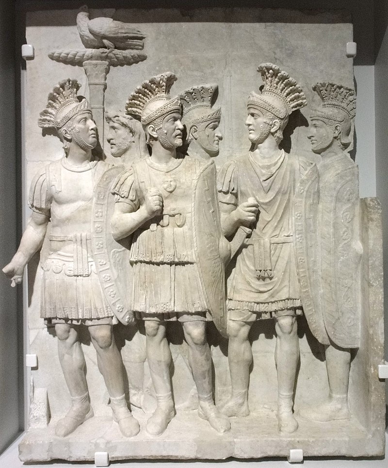 Бюст на Теодосий I С цел да се усили отбраната на империята, част то прииждащите племена са привлечени като съдружници и са позволени да се заселят в рамките на Рим. Сред тях се организират всеобщи военни набори, които обезпечават нови бойци за несекващата война. Тези „ нови хора “ получават римски имена, научават латински, покръстват се и биват асимилирани от космополитната средиземноморска цивилизация.