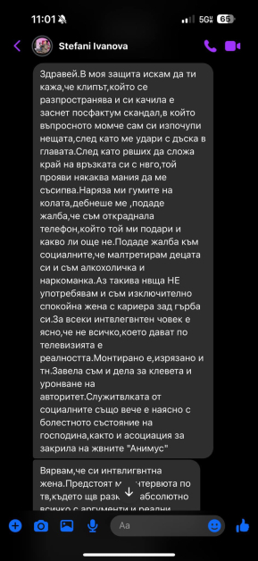 „ След като взех решение да сложа завършек на връзката си с него, той прояви фикс идея да ме унищожава. Наряза ми гумите, подаде тъжби против мен и популяризира погрешни изказвания за мен, “ написа тя. Иванова твърди, че е завела каузи за клюка и уронване на престижа.