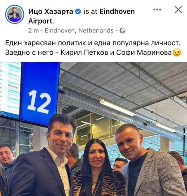 Ицо Хазарта и Кирил Петков изловиха Софи Маринова за фотография. Срещата е станала инцидентно на летище, само че евентуално без певицата да е ясно, че ще бъде употребена като реклама на Политическа партия.
