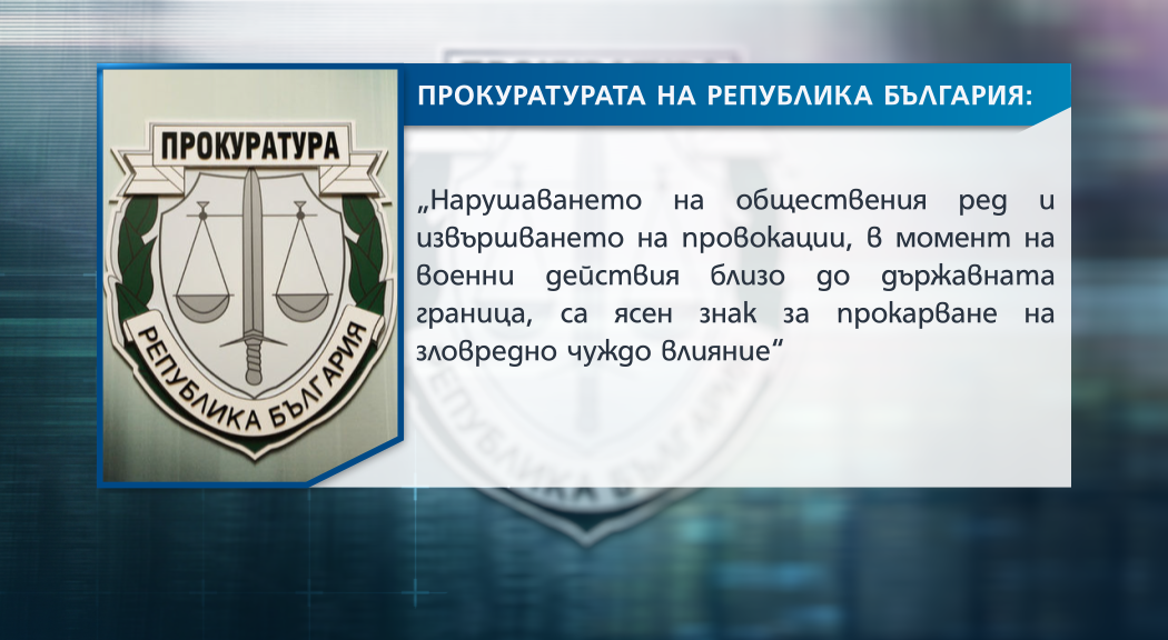 Нарушаването на публичния ред и осъществяването на провокации, в миг на военни дейности покрай държавната граница, са явен знак за пробутване на зловредно непознато въздействие, скрито зад изложение на националистически възгледи от представители на политически партии. Прокуратурата неведнъж е доказвала, че противодейства и ще противодейства на всеки опит за налагане на непознати ползи, показват от институцията, съобщи Нова тв.