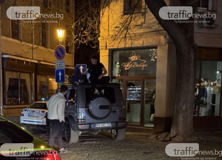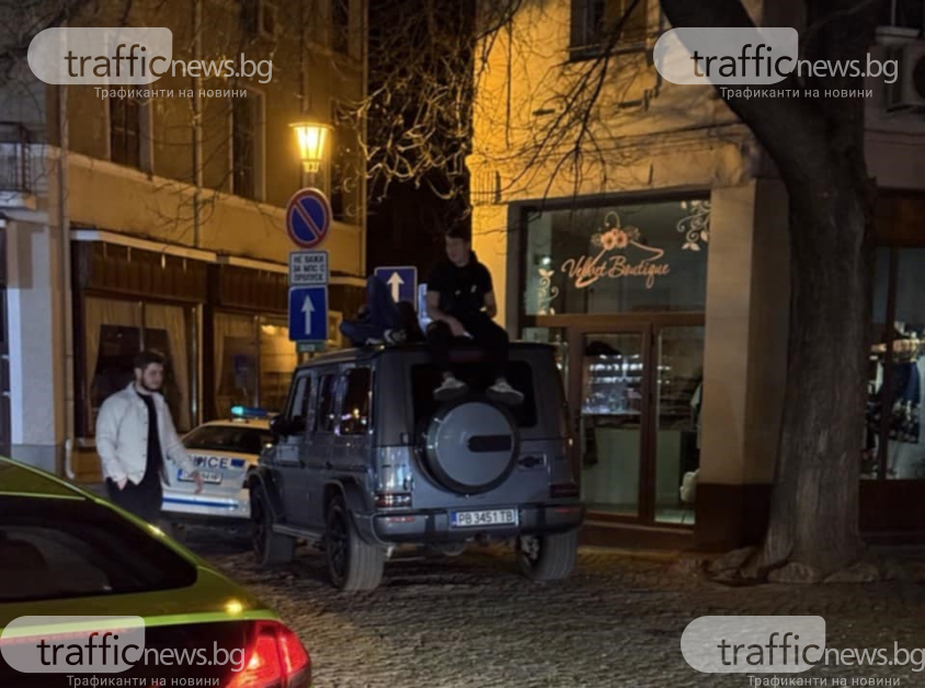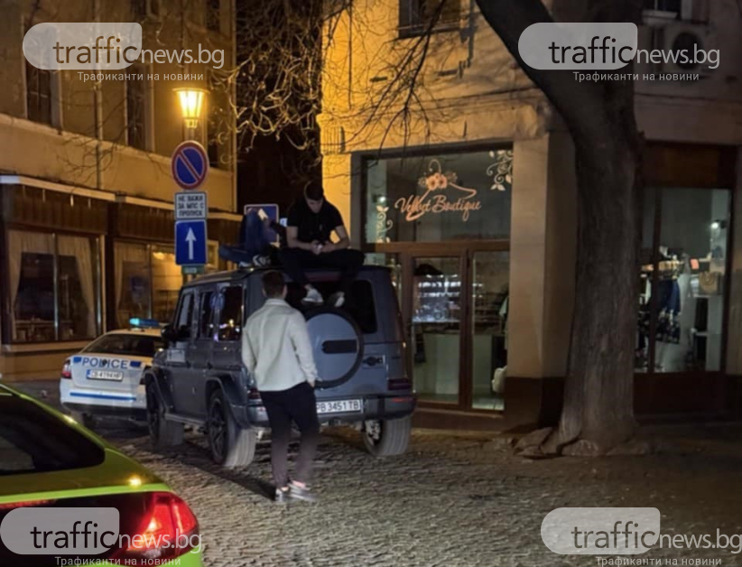 Почерпени младежи се катерят върху G-класа в Капана, до тях стои полиция „на буркани”