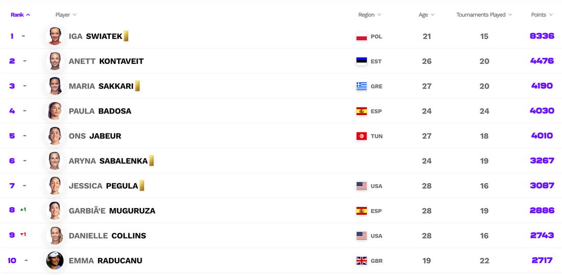 Полякинята Ига Швьонтек остава на върха с 8336 точки. Сред първите шест при дамите няма разбърквания, като втора продължава да бъде Анет Контавейт (Естония) с 4476 точки, а трета е Мария Сакари (Гърция) с 4190 точки. Челната петица допълват Паула Бадоса (Испания) с 4030 и Онс Жабьор (Тунис) с 4010 точки. Единствената смяна в топ 10 на ранглистата е осмата позиция на Гарбине Мугуруса, която измести от нея Даниел Колинс.