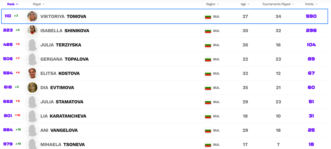 Джулия Терзийска губи три позиции и е 465-а със 104 точки, Гергана Топалова отстъпва със седем места до №506 с 89 точки, а при Елица Костова има спад от четири позиции и тя към този момент е 584-та с 67 точки.