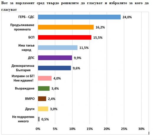 ГЕРБ резервира позицията си на първа политическа мощ с 24% от гласовете на твърдо решилите да гласоподават и избралите кого да поддържат. Изследванията от началото на акцията записват гладко разширение на електоралната поддръжка за ГЕРБ.