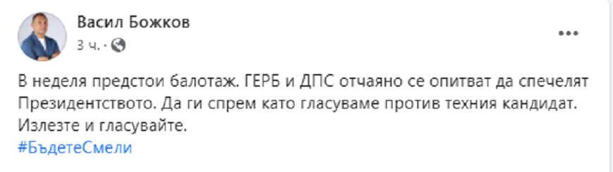 " В неделя следва балотаж. ГЕРБ и Движение за права и свободи обезверено се пробват да завоюват Президентството. Да ги спрем като гласуваме срещу техния претендент. Излезте и гласувайте ", написа в профила си във Facebook Васил Божков.