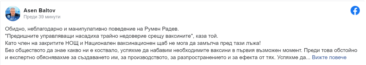 " Без обществото да знае какво ни е коствало, успяхме да набавим нужните ваксини в първия вероятен миг. Преди това обширно и експертно обяснявахме за основаването им, за производството, за разпространяването и за резултата от тях. Успяхме да организираме експресна имунизация на най-уязвимите групи, при първа опция отворихме " зелени " коридори за всички. Няма да не преставам да изброявам. Ще кажа единствено, че щом Румен Радев си разреши да употребява предизборния си девиз от залата на президентството, задачата на това неделно свиждане не е въвеждане на ефикасни ограничения, а симулация на закъсняла ангажираност! ", реагира остро Балтов.