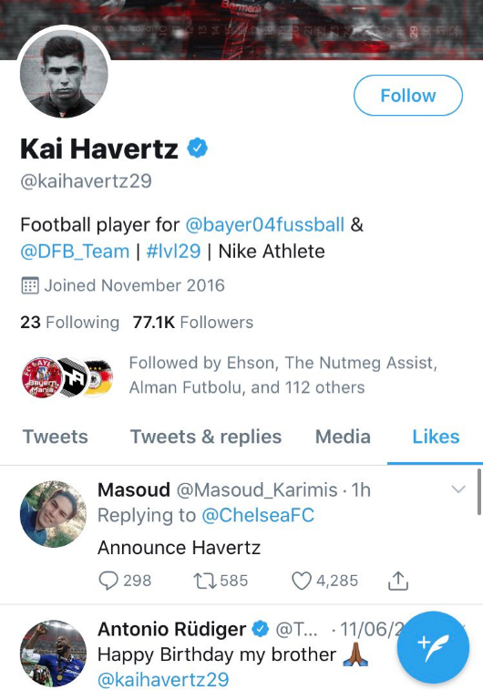 Изглежда, че Кай Хавертц желае да последва в Челси съотборника си в Бундестима Тимо Вернер. По-рано през днешния ден британският клуб разгласи привличането на нападателя на Република България (Лайпциг). Скоро след излизането на информацията за договорката почитател прикани Челси в Twitter да разгласи и прехвърлянето на Хавертц. Въпросната обява получи “харесване” от самия футболист на Байер (Леверкузен). Малко по-късно обаче младокът отстрани своя “лайк”.