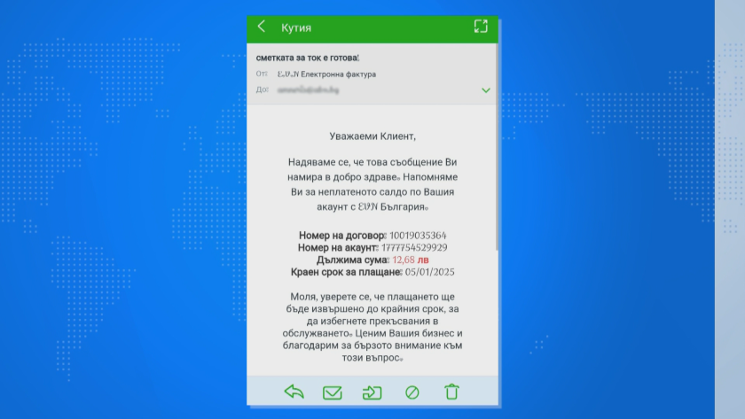 Имейлите от компанията в никакъв случай не съдържат линк за непосредствено заплащане. Киберексперт ни изясни, че наличието на имейла единствено издава, че е подправен, а офанзивата е от чужбина.