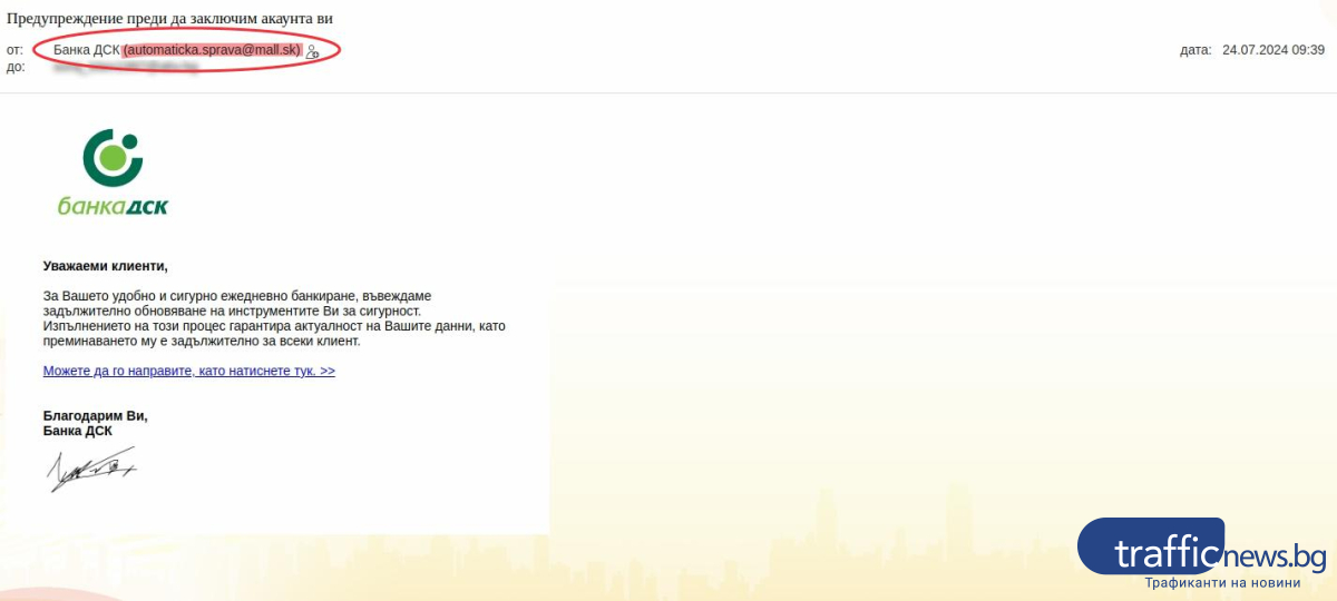 „ За Вашето комфортно и несъмнено всекидневно банкиране, вкарваме наложително възобновяване на инструментите Ви за сигурност. Изпълнението на този развой подсигурява новост на Вашите данни, като прекосяването му е наложително за всеки клиент. “,се показва в известието. Справка сочи, че адресът, от който се праща известието, е словашки.