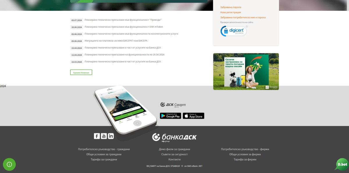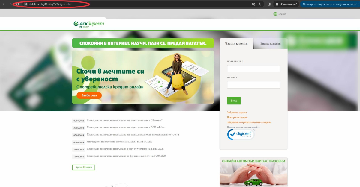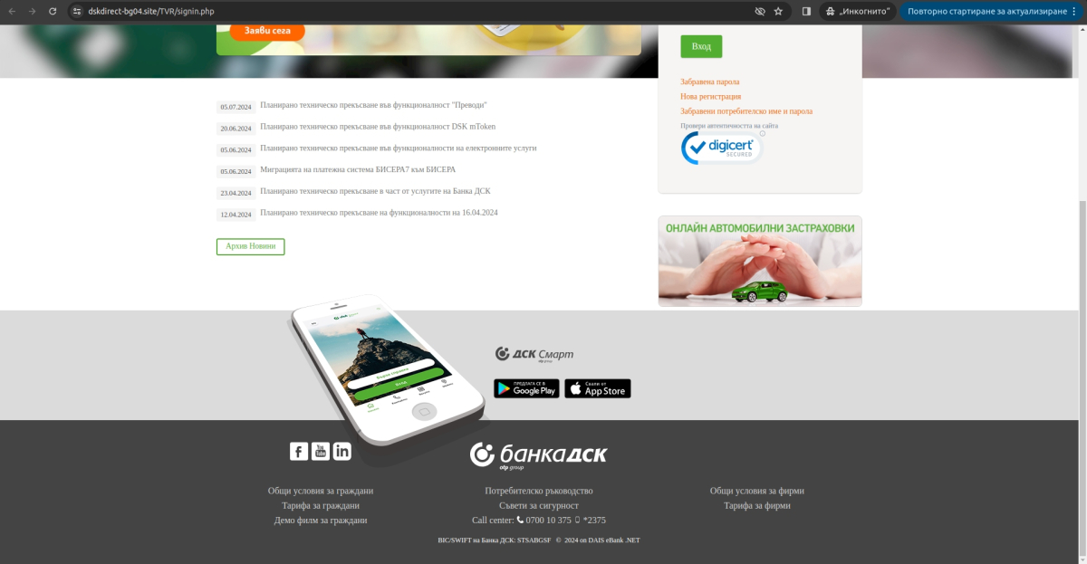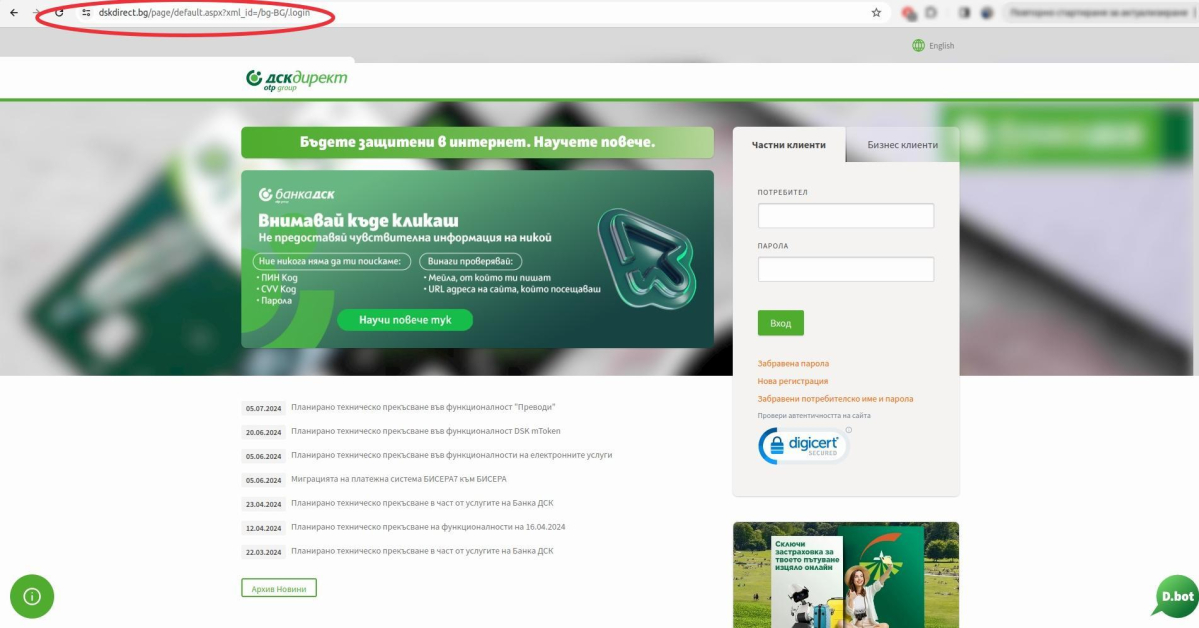 От Банка ДСК уведомяват, че след серия недоволства от консуматори е регистриран опит за фишинг машинация, злоупотребяващ с името им.