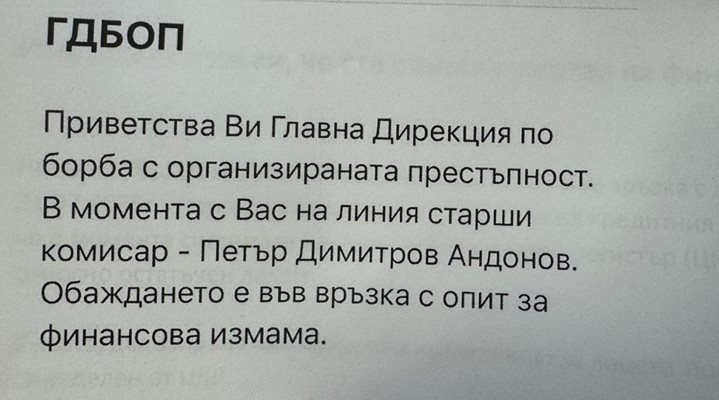 ГДБОП предизвестява за финансова машинация, при която се злоупотребява с името на службата и се вкарват жители в подвеждане по телефона за това, че спомагат за попречване на закононарушение и опит за източване на банковите им сметки. В същото време, задачата на процеса е тегленето на заем или превод на пари в интерес на измамниците.