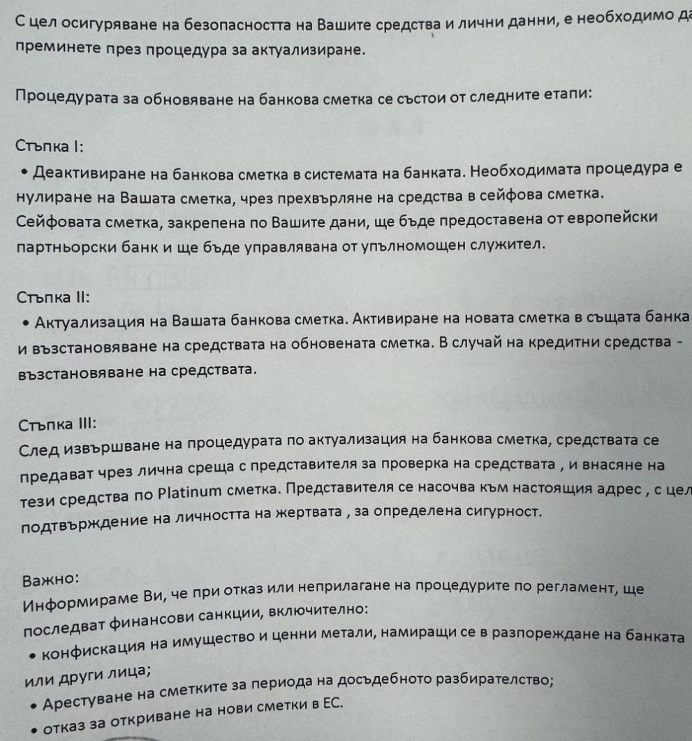 Най-често мнимият представител на Българска народна банка е жена, представяща се с името Антоанета Иванова Георгиева. Тя удостоверява, че процедурата изисква потребителят или да преведе налични средства, или да изтегли потребителски заем, който ще бъде възобновен. Тя обръща внимание и на „ изискването “ в документите, че в случай че процедурата не бъде спазена, клиентът предстои на наказателна отговорност и наказания, включващи даже конфискация на имущество и блокиране на сметки до привършване на досъдебното произвеждане по откриване на закононарушението.