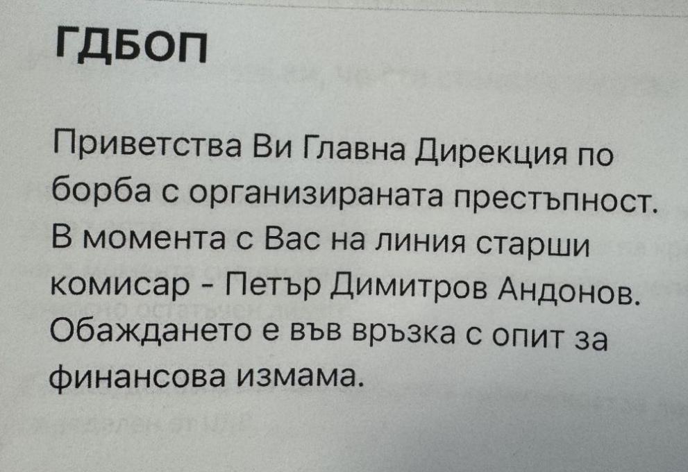 ГДБОП предизвестява за финансова машинация, при която се злоупотребява с името на службата и се вкарват жители в подвеждане по телефона за това, че спомагат за попречване на закононарушение и опит за източване на банковите им сметки. В същото време, задачата на процеса е тегленето на заем или превод на пари в интерес на измамниците.