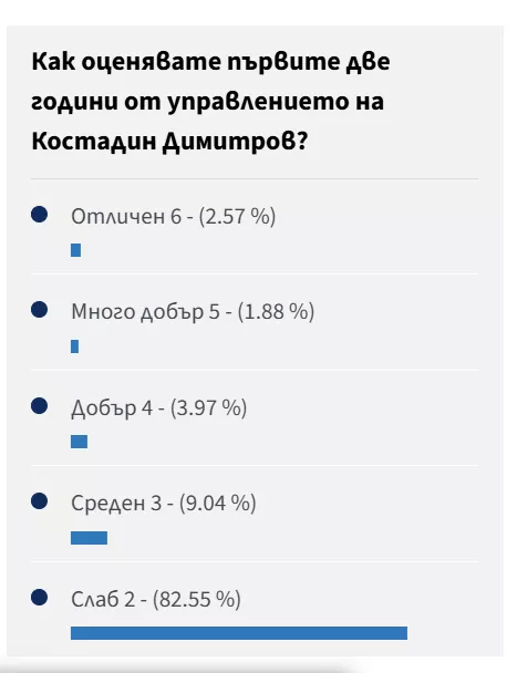 Само преди дни завърши и онлайн анкетата на TrafficNews , в която взеха присъединяване близо 9000 души. Резултатите демонстрират, че междинната оценка за кмета е „ Слаб “ – 2,30. Разпределението на гласовете е следното:
