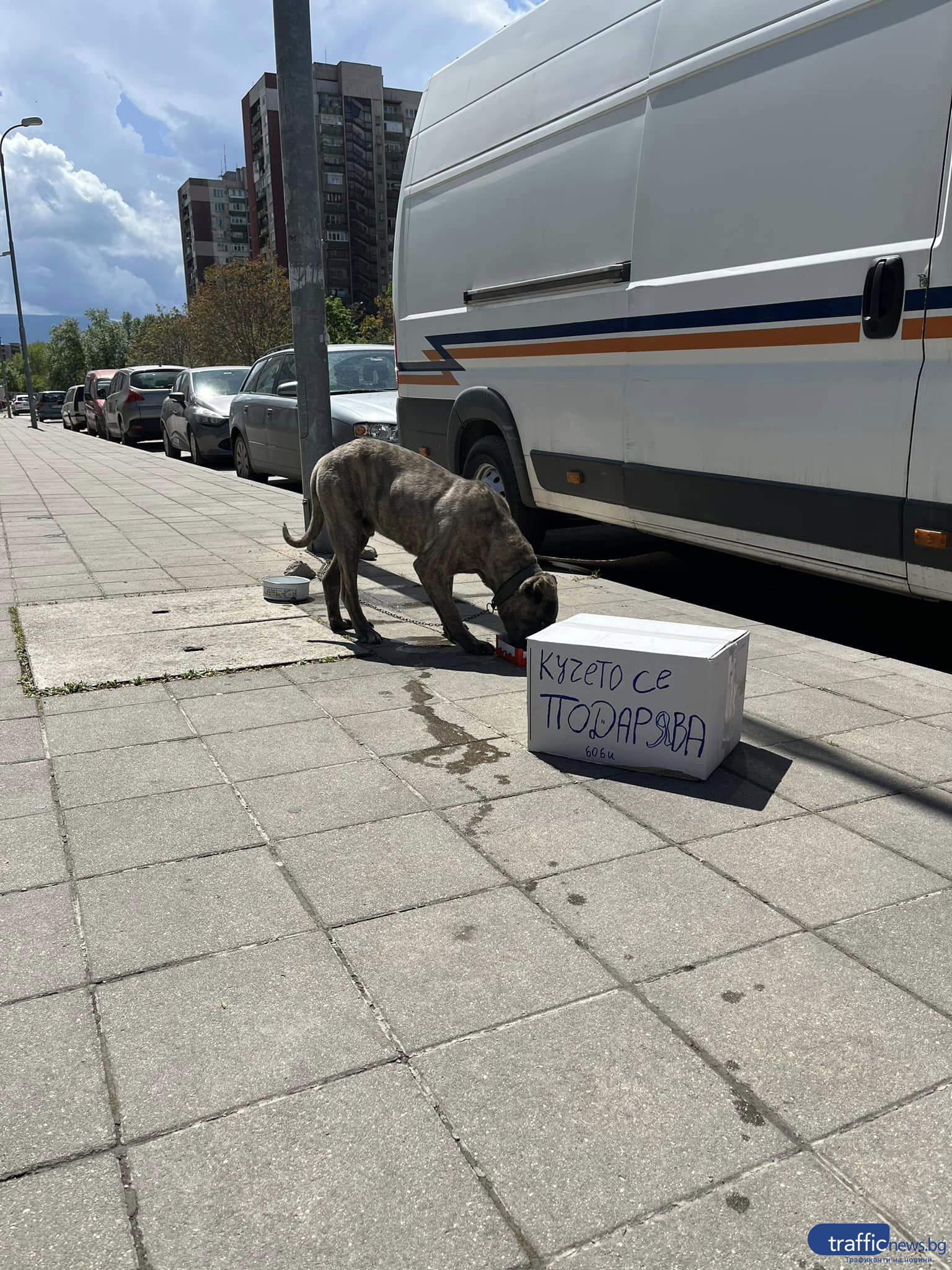 Изоставиха куче на улица в Пловдив. Животното е от порода Кане Корсо, а към този момент някогашните му притежатели са го вързали на дирек до ритейл парк на улица „ Македония ”.