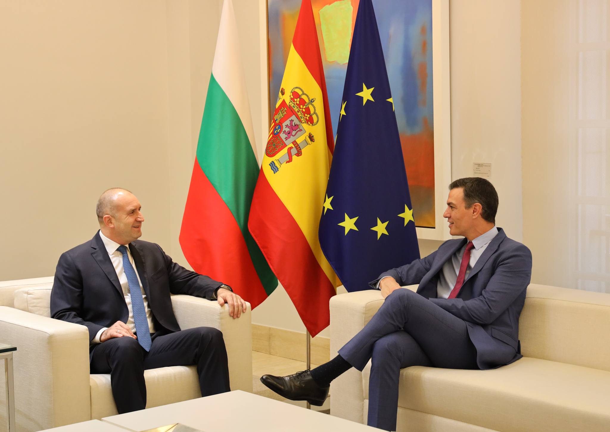 Това е първа аудиенция на български държавен глава в страната от 23 години насам. Радев се срещна с премиера на Испания Педро Санчес, в този момент следва да приказва и с краля на страната.