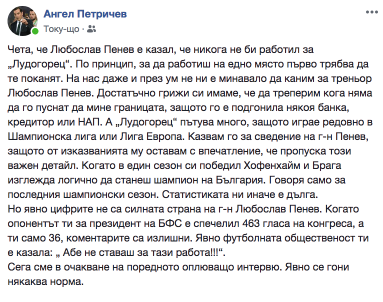Изпълнителният шеф на Лудогорец - Ангел Петричев, разгласява изострен пост в формалната си страница във Facebook във връзка офанзивата на треньора на ЦСКА-София Любослав Пенев. Бившият футболист съобщи, че част от купите на " орлите " не са заслужени и, че не би работил в Лудогорец. Петричев показа, че " с цел да работиш на едно място първо би трябвало да те поканят ". Той написа още, че на Лудогорец през мозъка не им е минавало да поканят Пенев за треньор, защото би трябвало да треперят по кое време няма да го пуснат да мине през граница, тъй като го е подгонила някоя банка, заемодател или Национална агенция за приходите. Ето какво написа Ангел Петричев: " Чета, че Любослав Пенев е споделил, че в никакъв случай не би работил за „ Лудогорец “. По принцип, с цел да работиш на едно място първо би трябвало да те поканят. На нас дори и през разум не ни е минавало да каним за треньор Любослав Пенев. Достатъчно грижи си имаме, че да треперим по кое време няма да го пуснат да мине границата, тъй като го е подгонила някоя банка, заемодател или Национална агенция за приходите. А „ Лудогорец “ пътува доста, тъй като играе постоянно в Шампионска лига или Лига Европа. Казвам го за сведение на господин Пенев, тъй като от изявленията му оставам с усещане, че пропуща този значим подробност. Когато в един сезон си победил Хофенхайм и Брага наподобява разумно да станеш първенец на България. Говоря единствено за последния шампионски сезон. Статистиката ни другояче е дълга. Но очевидно цифрите не са мощната страна на господин Любослав Пенев. Когато съперникът ти за президент на БФС е спечелил 463 гласа на конгреса, а ти единствено 36, мненията са непотребни. Явно футболната общност ти е споделила: „ Абе не ставаш за тази работа!!! “. Сега сме в очакване на следващото оплюващо изявление. Явно се гони някаква норма ".