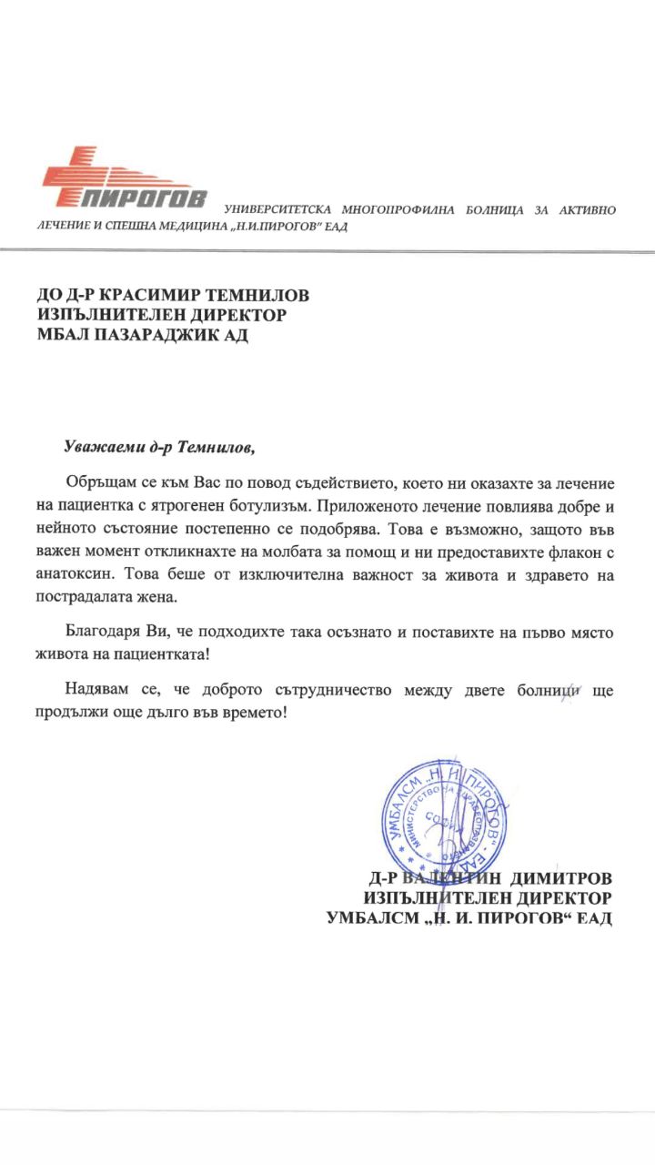 Изпълнителният шеф на УМБАЛСМ „ Н. И. Пирогов ” доктор Валентин Димитров изпрати благодарствено писмо до изпълнителния шеф на МБАЛ – Пазарджик доктор Красимир Темнилов, оповестяват от лечебното заведение. То е във връзка оказаното подпомагане за лекуване на пациентка с ятрогенен ботулизъм. Д-р Димитров осведоми, че приложеното лекуване се повлиява добре на пациентката и нейното положение последователно се усъвършенства.