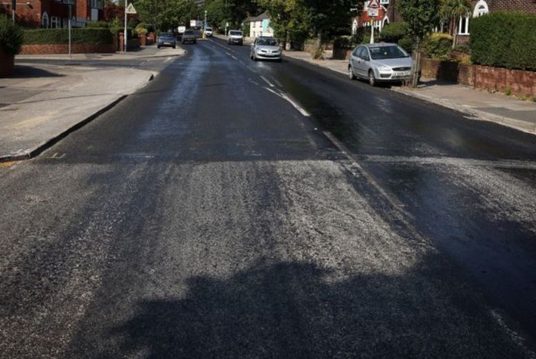Път в Манчестър се трансформира в лепкава черна слуз, защото топлината втечни асфалта.
