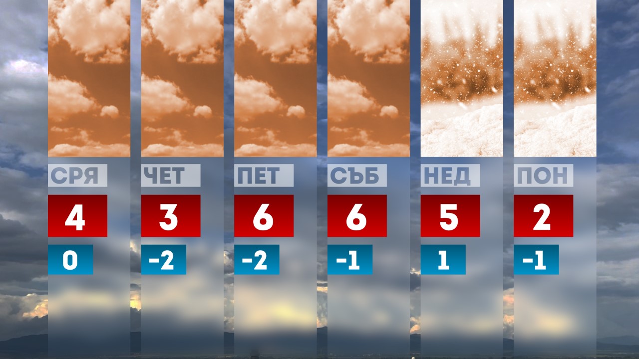 До края на седмицата времето ще е относително изсъхнало, с променлива облачност и дневни температури към 5 градуса. На 1 януари е допустимо да прехвърчи слаб сняг на изолирани места в планините. След това условия за снеговалеж ще има още веднъж чак в неделя и понеделник.