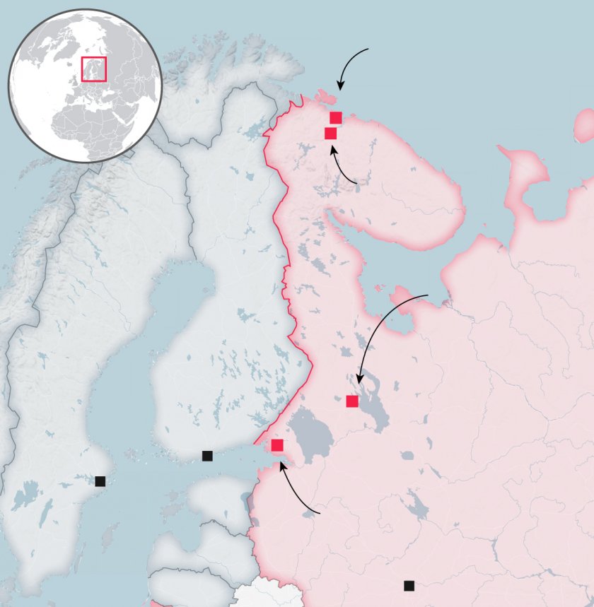Появиха се сателитни фотоси, показващи скупчването на съветски сили единствено на няколко километра от финландската граница, като има доказателства, че Москва построява места за настаняване на войски, самолетна инфраструктура и други нови уреди в основни военни бази, оповестява " Дейли мейл ".