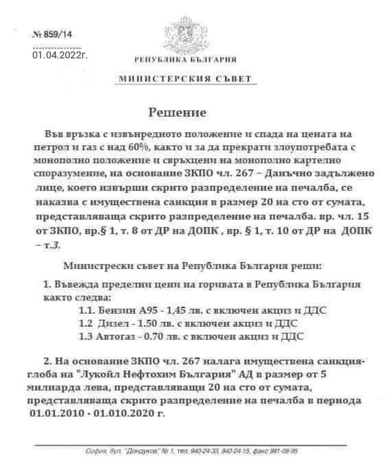 Извънредно на 1 април държавното управление реши да постави пределни цени на горивата. Документ с безспорна неавтентичност сподели, че от през днешния ден бензинът става 1,45 лева, дизелът – 1,50 лв., а синьото гориво - 70 стотинки.