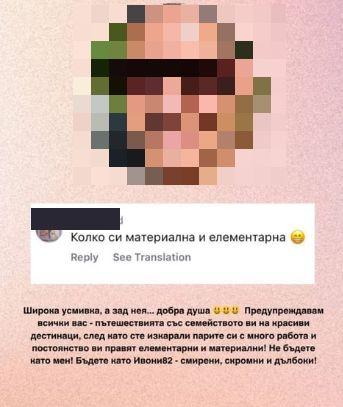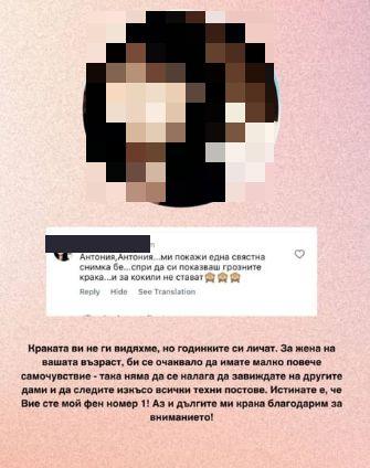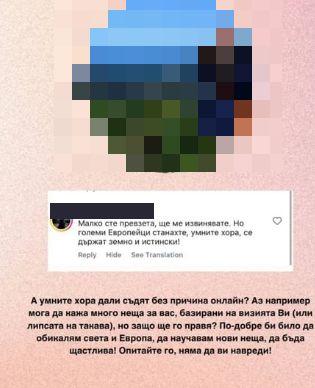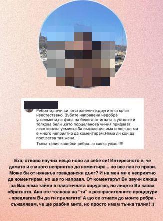 Миската разгласява няколко от забележимите отрицателни мнения под фотосите си (всички останали са изтрити грижливо), като сподели и лицата на потребителите, дръзнали да си кажат мнението.