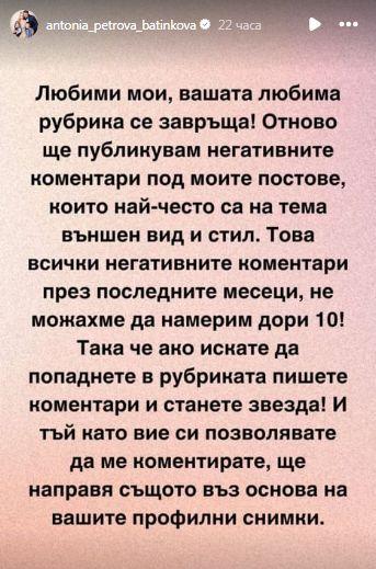 Известен факт е, че Антония Петрова е една от най-обидчивите родни миски и сън не спи, с цел да дебне и трие отрицателни мнения под фотосите си, разкри Неслучайно в Инстаграм страницата й в никакъв случай няма да прочетете и един неприятен отзвук, а във Facebook профила й мненията са неразрешени за „ простолюдието “. Самата Тоца твърди, че не обръща внимание на хейта, само че в това време усърдно се е погрижила всяка обидна дума по неин адрес да изчезне от обществените мрежи.