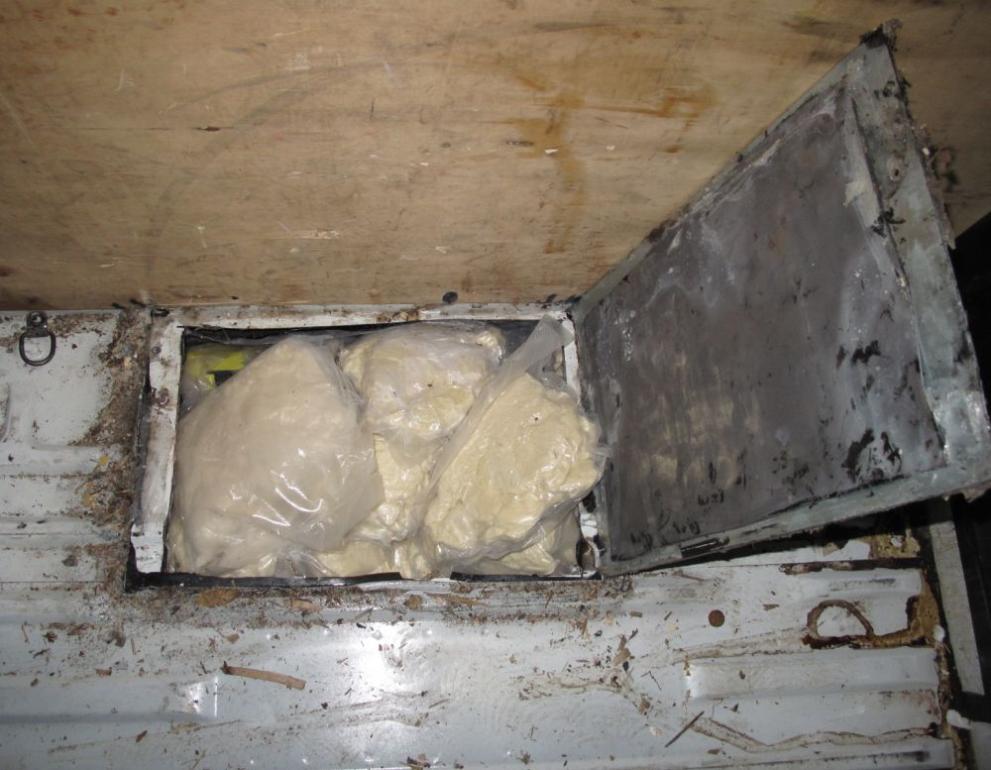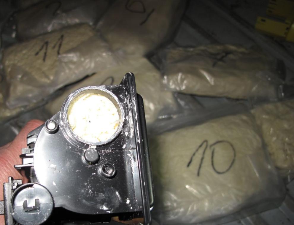 Министерство на вътрешните работи Идентифицирани са зони с необикновена компактност в пода на транспортното средство, а при физическия надзор там е бил открит построен тайник. Открити са 7 тонер касети и 28 вакуумирани пакета с кокаин . Общото конфискувано количество на дрогата е 40.9 кг.