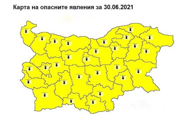 Ж ълт код за високи температури е разгласен за всички области на България за последния ден на юни, оповестяват от Национален институт по метеорология и хидрология.