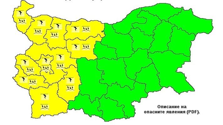 Жълт код е публикуван за 11 области на страната за през днешния ден. Това демонстрират данните на Национален институт по метеорология и хидрология (НИМХ). Предупреждението е в действие за София град, София област, Видин, Монтана, Враца, Плевен, Ловеч, Перник, Благоевград, Кюстендил и Пазарджик.