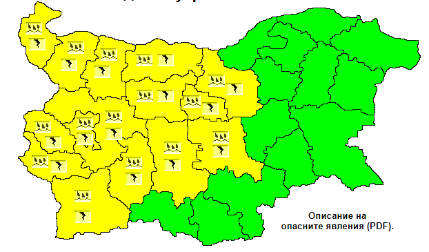 Жълт код е разгласен за Пловдив и още 13 области на страната. Очакват се интензивни превалявания, съпроводени с грумотевици. След обяд и до среднощ в региона на Пловдив ще има местни интензивни, обилни по количество превалявания (25-30 mm), съпроводени с гръмотевични стихии. Интензивните превалявания и гръмотевични стихии ще продължат и през нощта против петък, оповестяват от Национален институт по метеорология и хидрология.