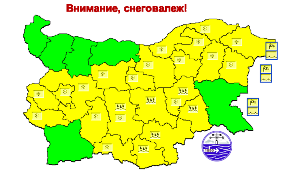 В областите Варна, Велико Търново, Габрово, Добрич, Ловеч, Кюстендил, Пазарджик, Перник, Разград, Русе, Силистра, Сливен, Смолян, София град, София област, Търговище, Шумен предизвестието е за превалявания от сняг.