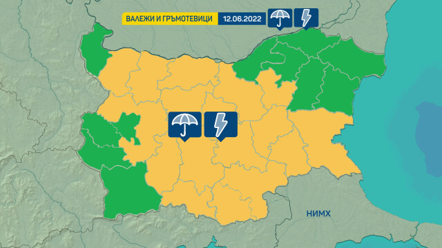 Жълт код за интензивни превалявания с гръмотевици е разгласен в съвсем цялата страна през идващите 24 часа. Очакваните количества са сред 20 и 35 литра на квадратен метър.