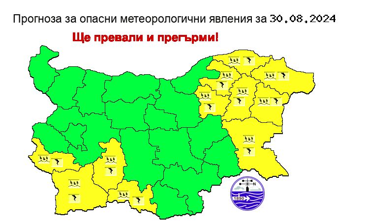 Жълт код за краткотрайни превалявания с гръмотевици в 11 области разгласи Национален институт по метеорология и хидрология за петък – 30 август. Областите са в Югозападна, Североизточна и Югоизточна България – Търговище, Разград, Шумен, Силистра, Добрич, Варна, Бургас, Смолян, Пазарджик, Благоевград и Кюстендил.